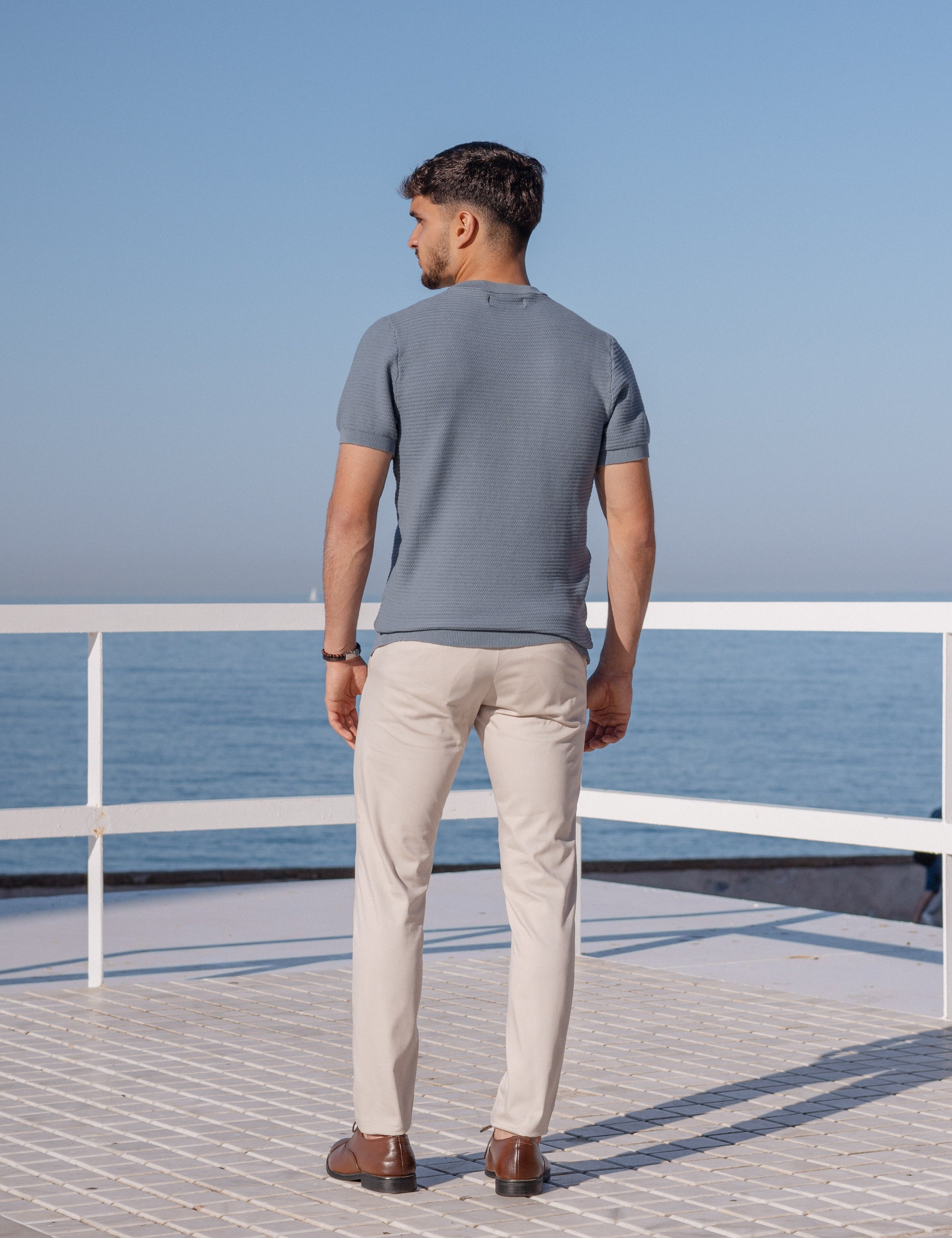 Camiseta tricot con estructura celeste para hombre. Cuello a la caja y manga corta. Corte regular fit.
