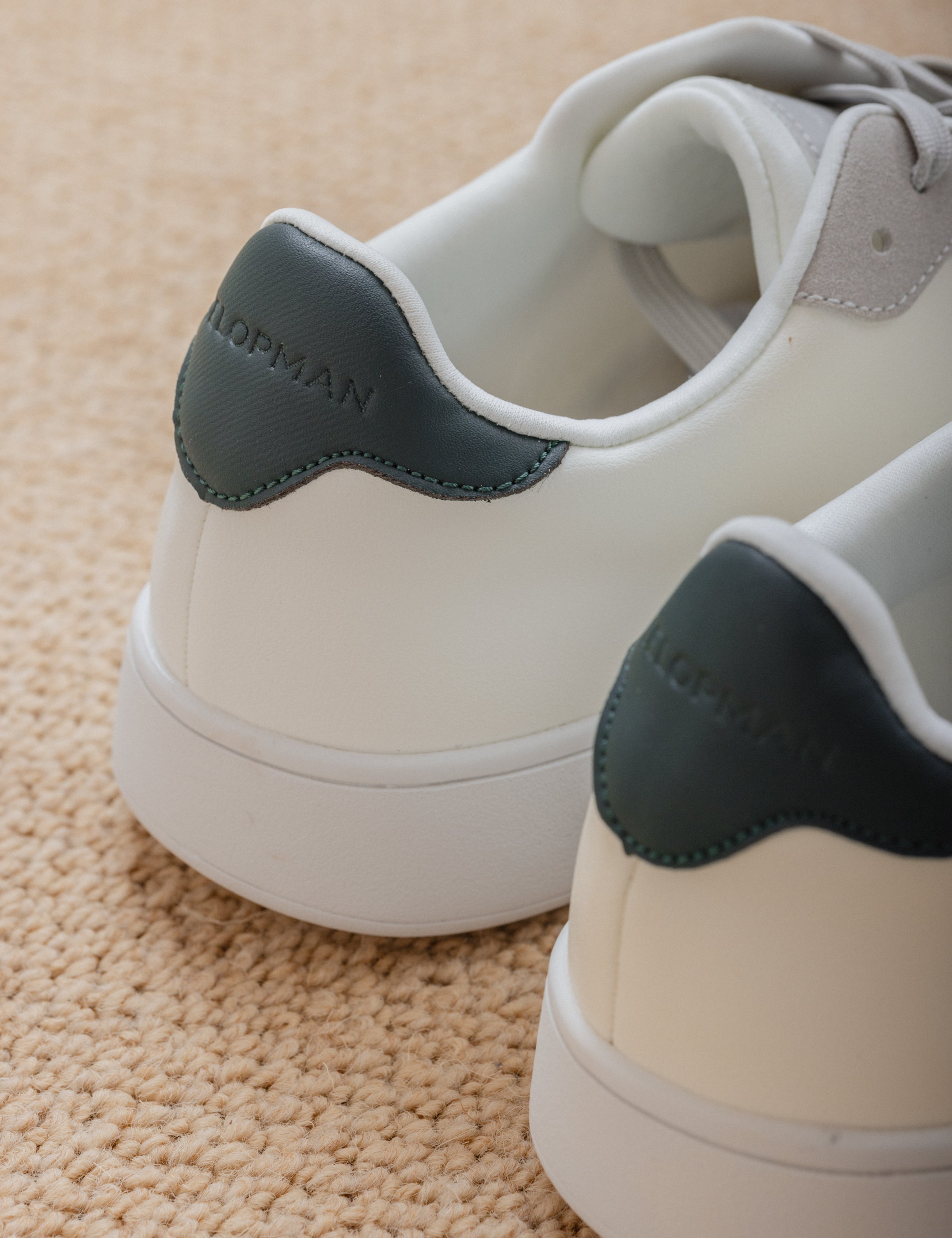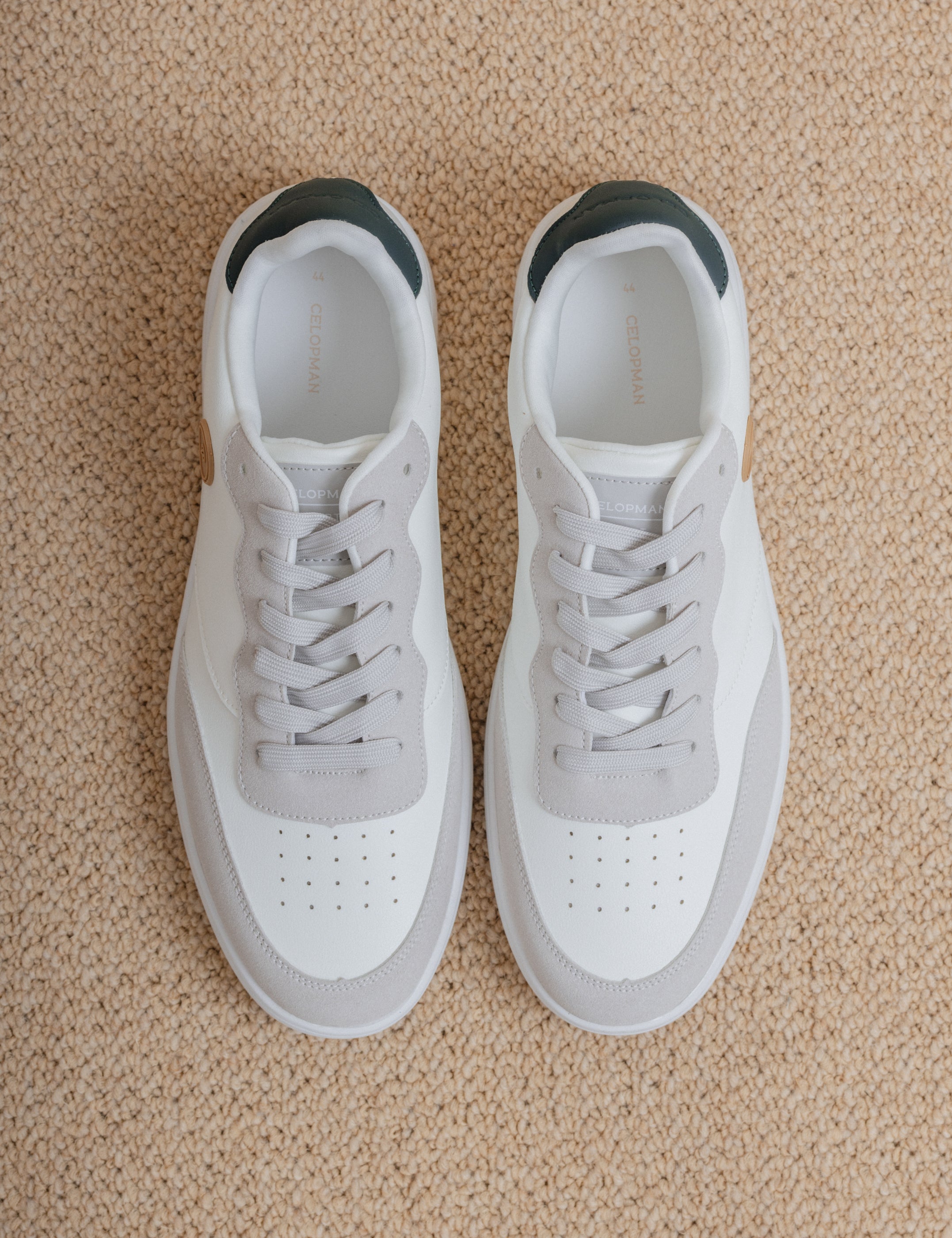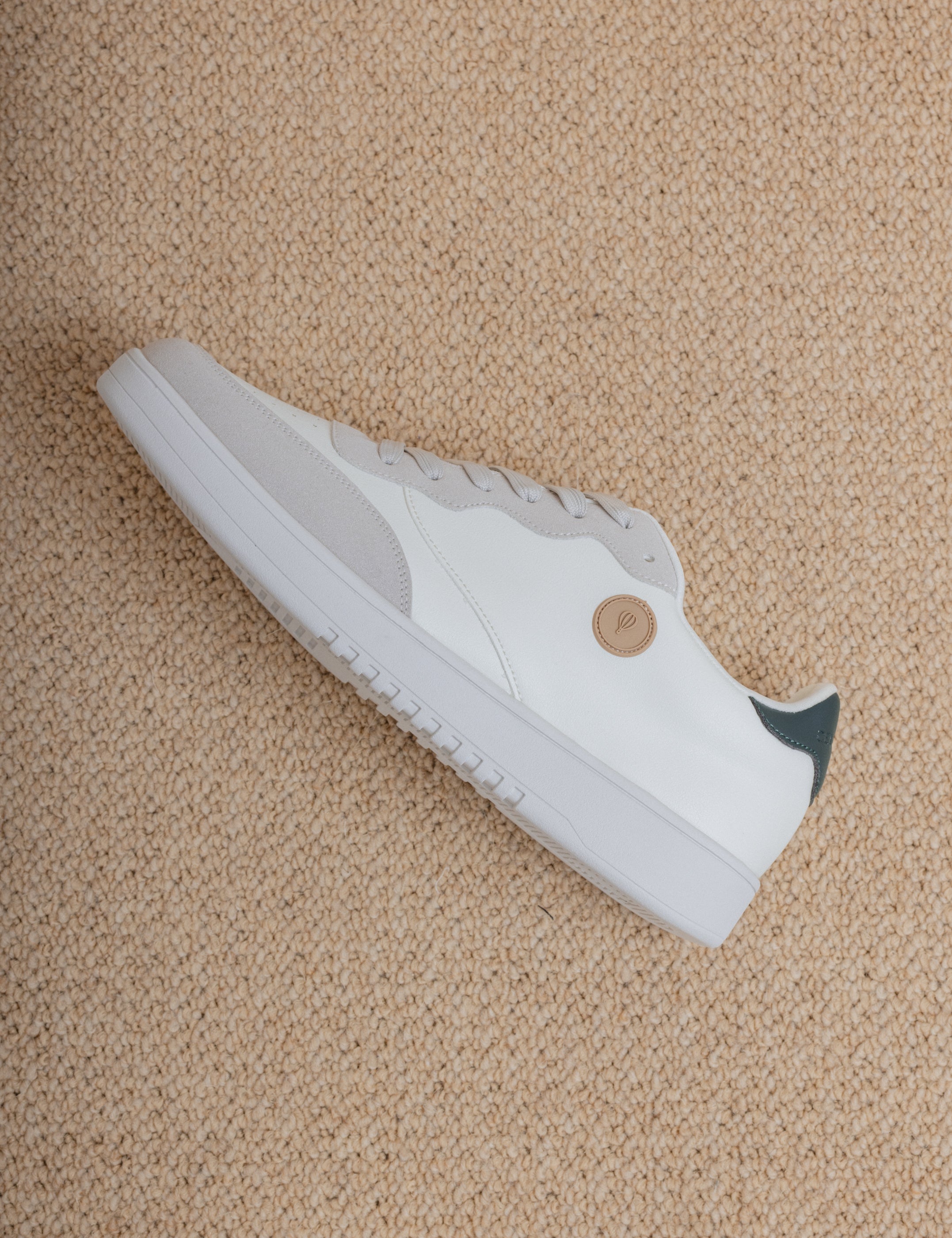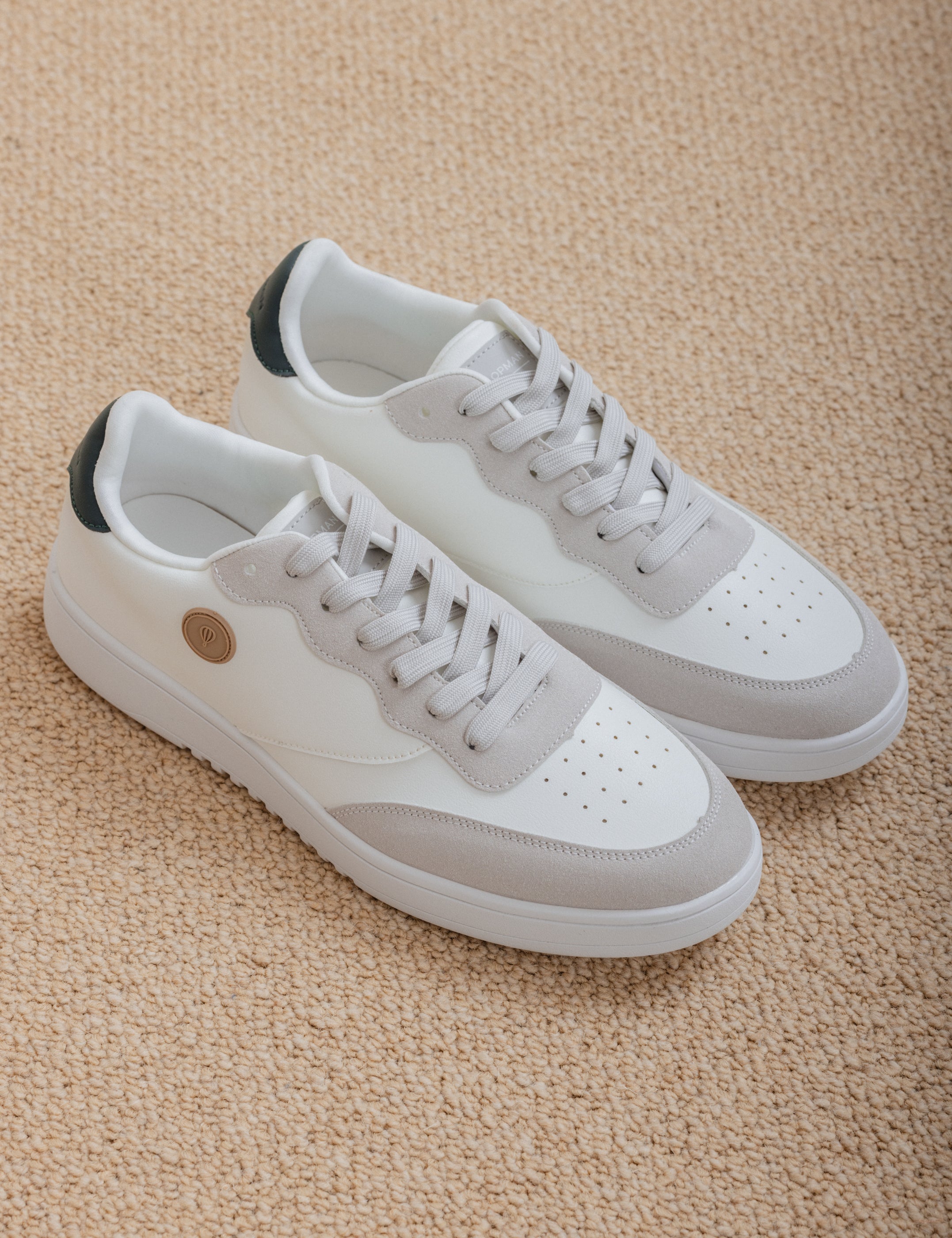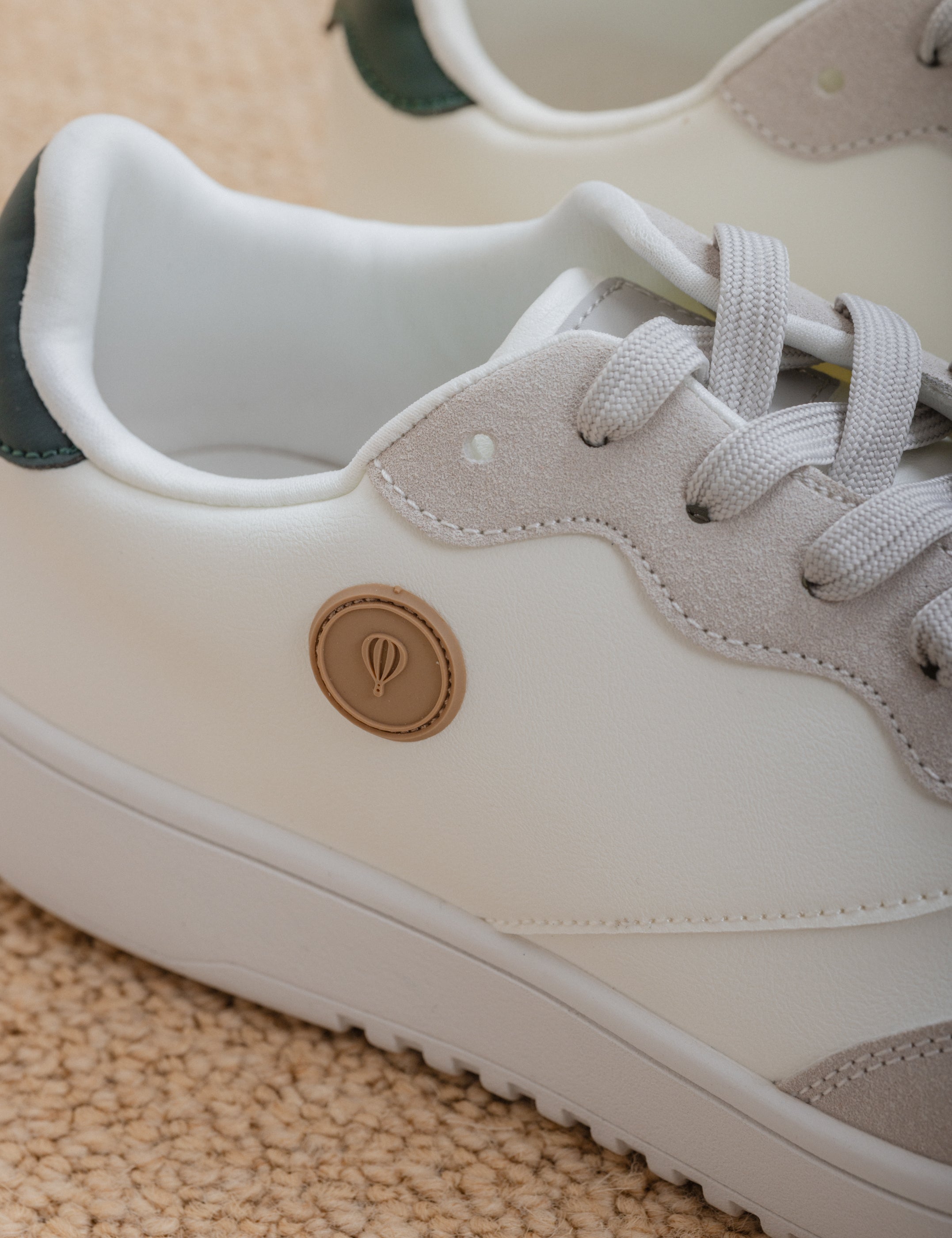 Zapato deportivo en color blanco, con zonas en contraste en color y tejido y logo de la marca en el lateral exterior. Suela de goma y cordones en blanco.