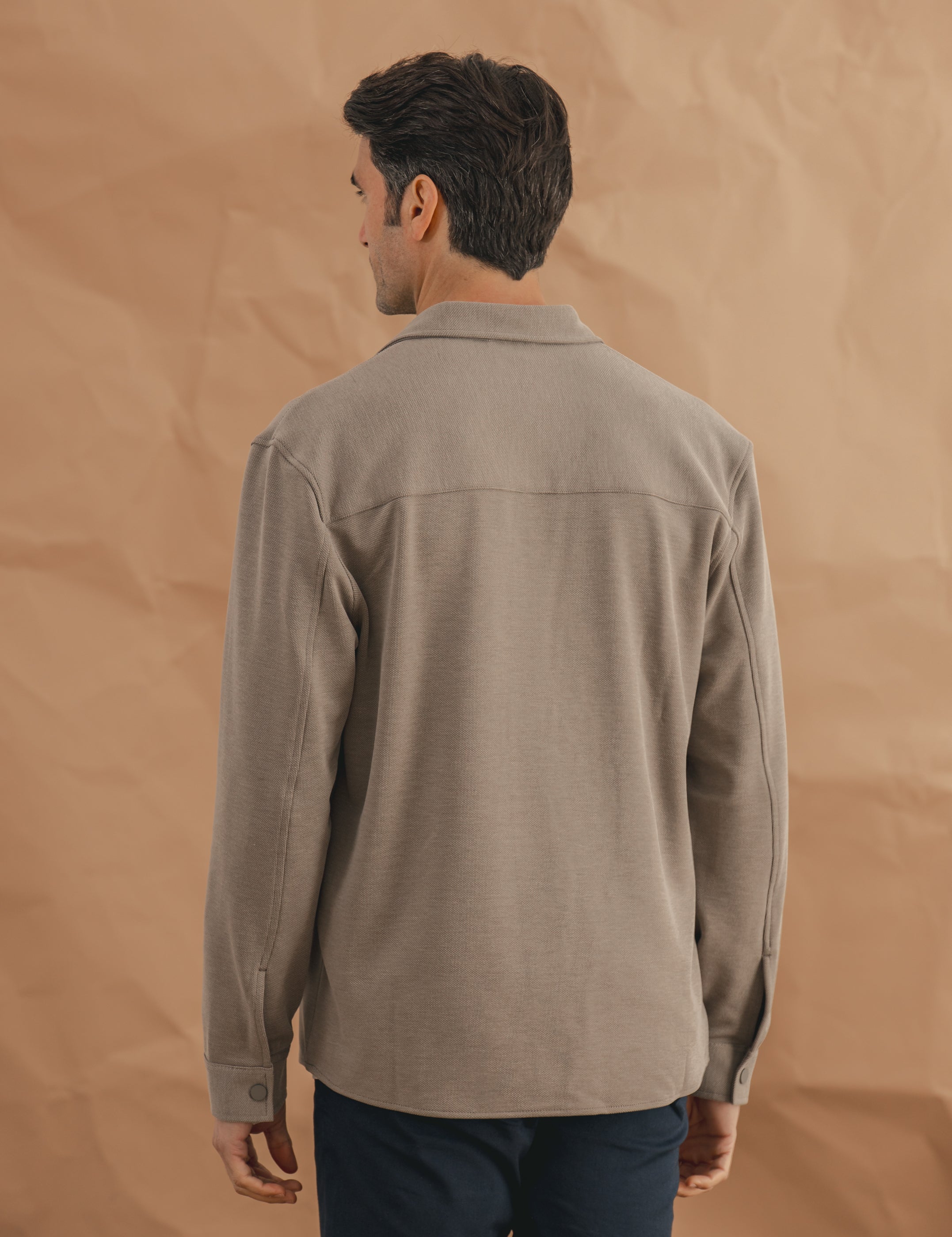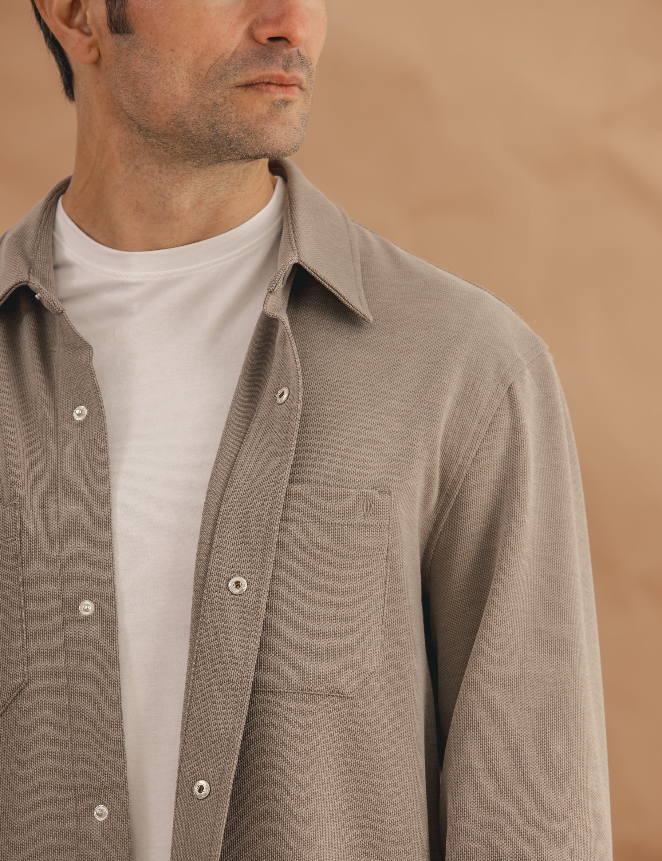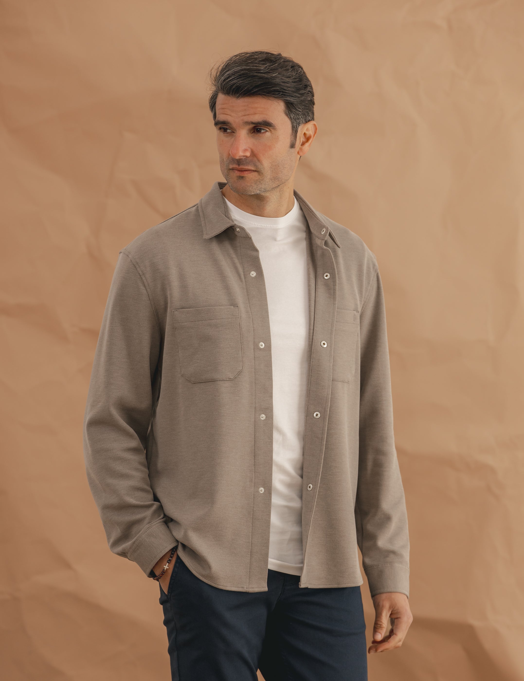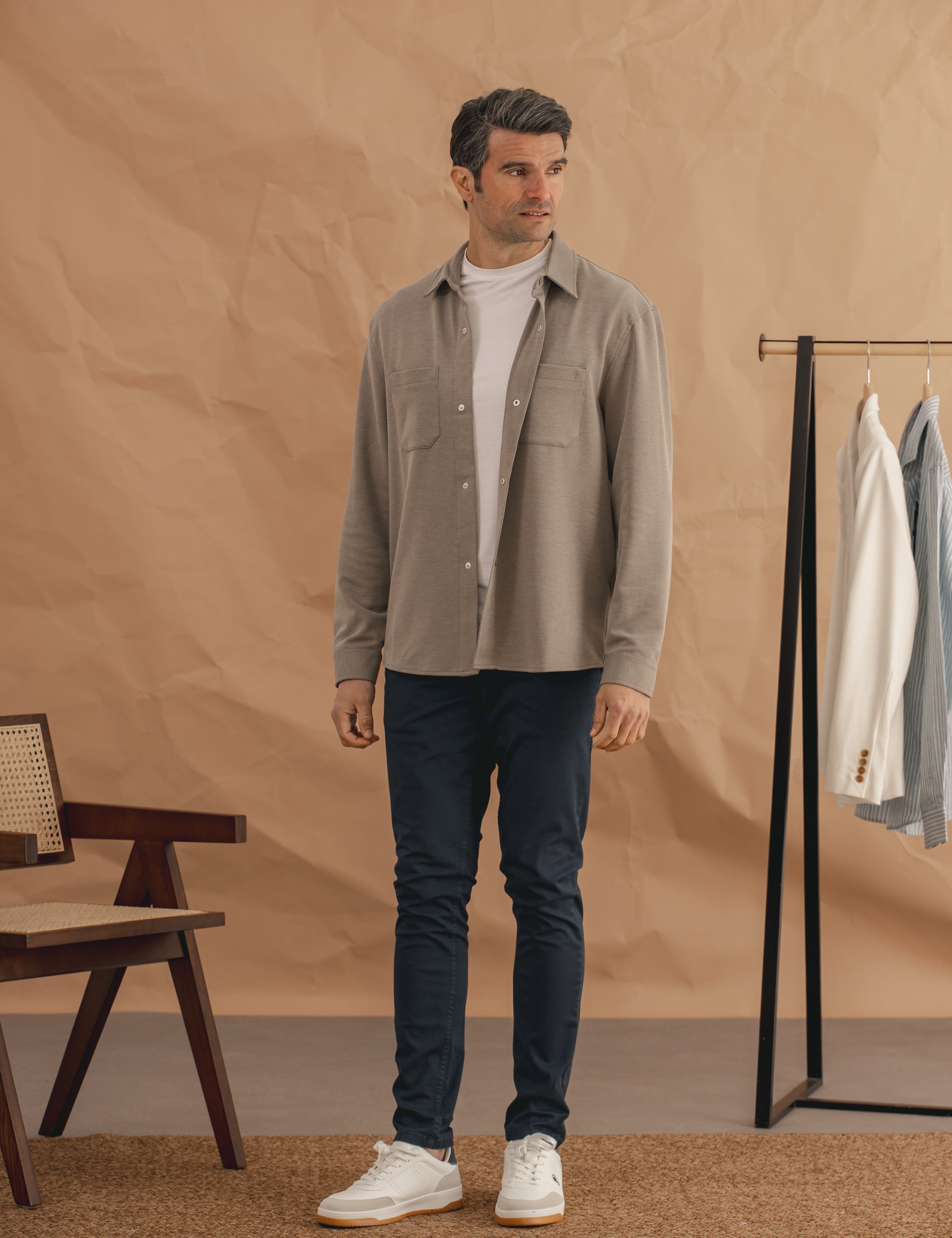 Sobrecamisa de hombre beige. Camisa de mangas largas, puños simples y corte regular fit. Dos bolsillos en la parte frontal a la altura del pecho.